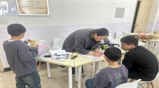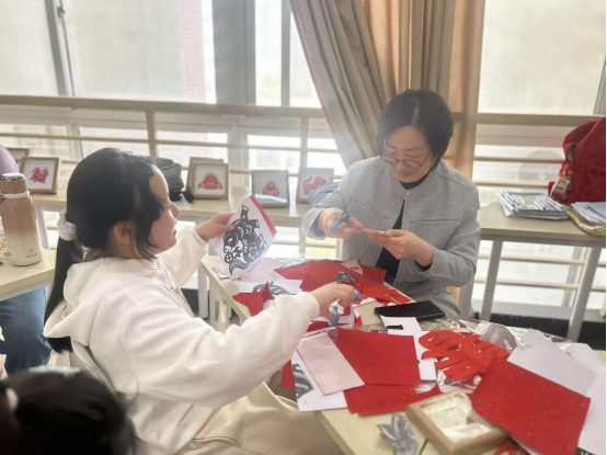 剪纸区则洋溢着非遗文化的独特魅力。方方老师以对称剪纸法教授“团花”与“立体春”字的制作技巧,孩子们在折叠与裁剪间,亲身体验到对称美学的奇妙之处。
